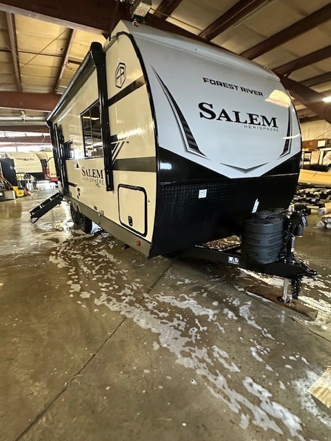 The Forest River Salem Hemisphere Hyper-Lyte 21RBHL is a lightweight, well-appointed travel trailer designed for couples or small camping groups who want a comfortable, feature-rich recreational vehicle that’s still tow-friendly for many half-ton trucks and SUVs. It’s part of the Hemisphere Hyper-Lyte series, which focuses on higher-end finishes, smart floorplans, and enhanced construction compared with entry-level campers. With a dry weight under ~5,000 lbs and moderate hitch weight, this trailer is towable by many half-ton and smaller 3/4-ton trucks or SUVs — making it accessible to a lot of couples or solo travelers who want a comfortable home-like RV as well as weekend warriors or extended trip adventurers who value good storage and functional living spaces. It appeals to owners who want a feature-rich trailer with upgraded finishes without stepping up into large or heavy fifth wheels.
