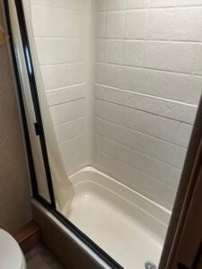 In the rear of the camper, you’ll find a full bathroom with a foot-flush toilet and shower stall with soft shower door.