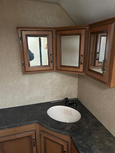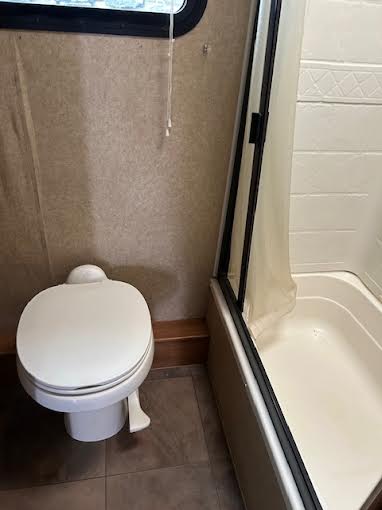 In the rear of the camper, you’ll find a full bathroom with a foot-flush toilet and shower stall with soft shower door.