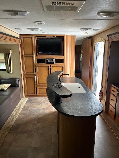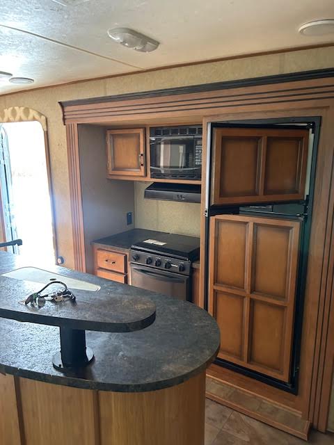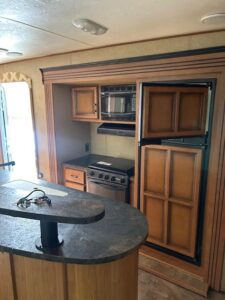 The kitchen is equipped with a center island for extra counter space, gas/electric refrigerator, and gas/electric water heater, making it convenient whether you're camping with hookups or off-grid.