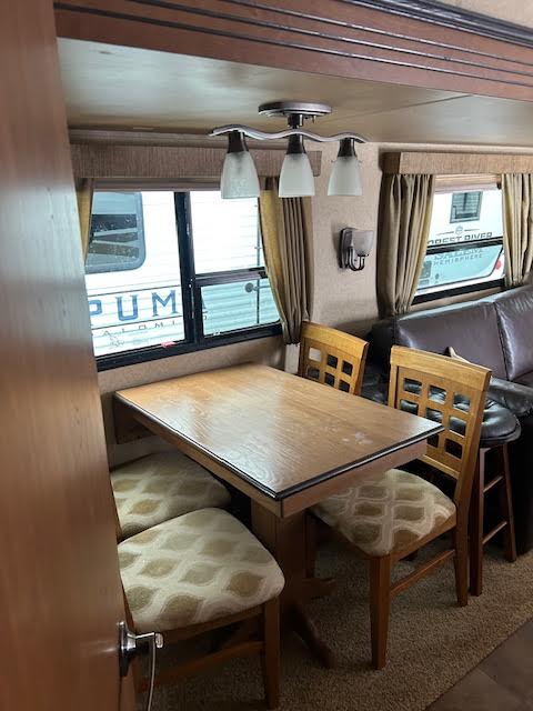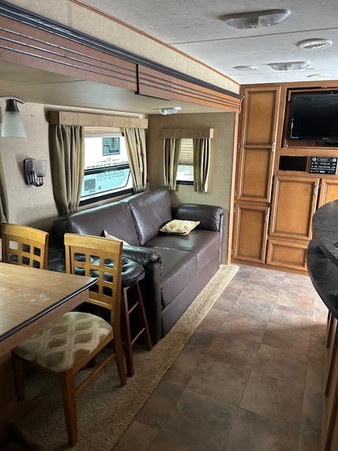 The front bedroom features a walk-around RV queen bed for easy access and comfort. The living area includes a sofa sleeper and free-standing dinette table, providing plenty of seating and extra sleeping space when needed.