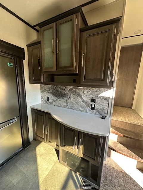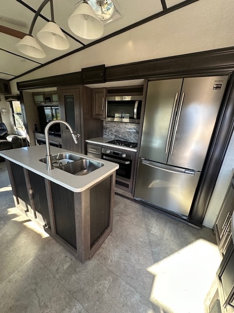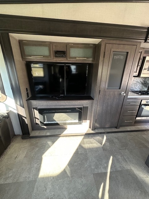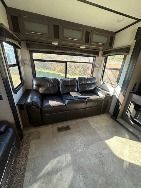 The rear living room layout features a welcoming entertainment area with a fireplace, large panoramic windows, and plush seating for relaxing after a day of adventure. The center island kitchen delivers abundant counter space and storage, complemented by a residential refrigerator for home-style convenience.