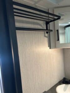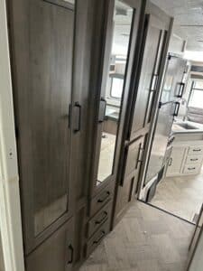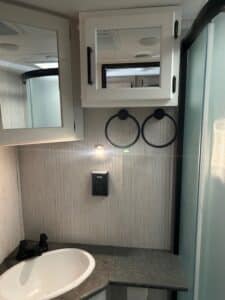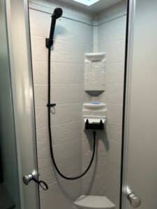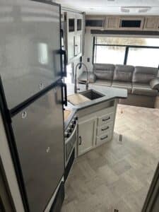 The kitchen is fully equipped for extended stays, offering a 3-burner range with oven, microwave, and RV-style gas/electric refrigerator. A gas/electric water heater provides reliable hot water whether you’re connected to shore power or camping off-grid.