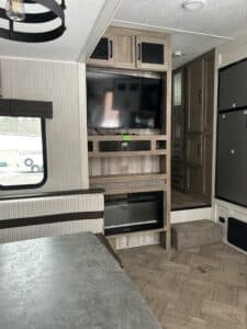 The living area feels open and inviting thanks to the large slide-out with a U-shaped dinette—perfect for family meals or additional sleeping space. At the rear, a jack-knife sofa provides comfortable seating by day and extra sleeping space by night. A 40” flat-screen TV and electric fireplace create a cozy entertainment area, while ducted heating and air conditioning ensure year-round comfort throughout the coach.