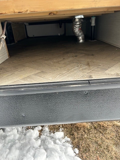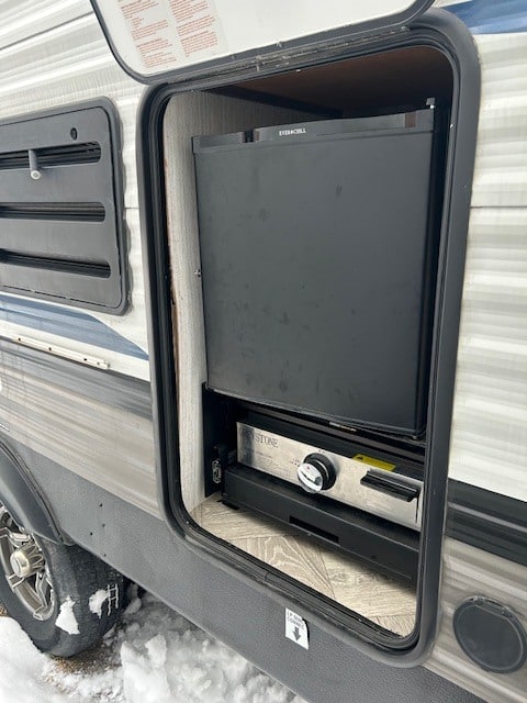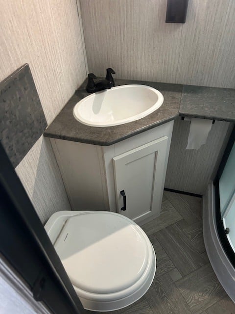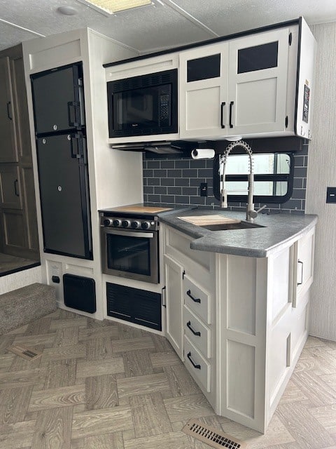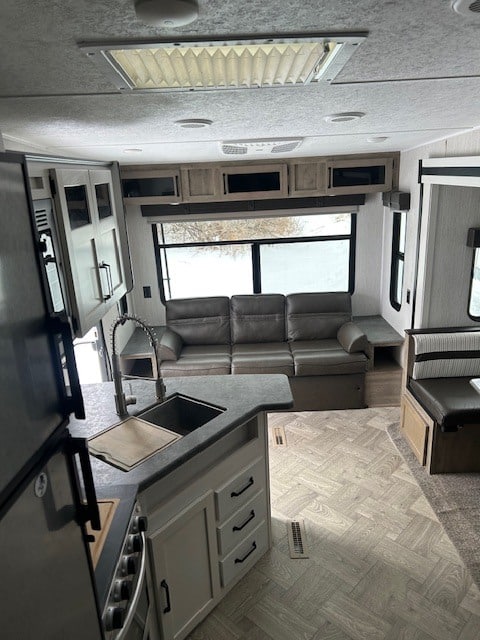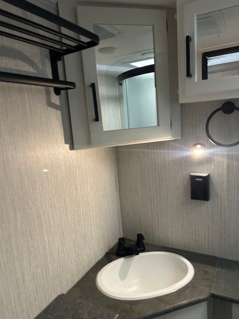 The kitchen is fully equipped for extended stays, offering a 3-burner range with oven, microwave, and RV-style gas/electric refrigerator. A gas/electric water heater provides reliable hot water whether you’re connected to shore power or camping off-grid.