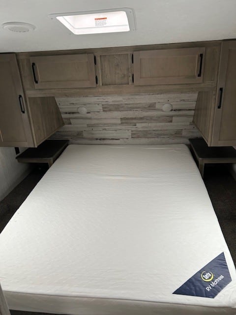 Up front, the private bedroom offers a comfortable RV queen bed, ample storage, and a sleek front fiberglass cap with LED accent lighting for a modern look. The side-aisle bathroom is spacious and practical, featuring a glass-enclosed shower stall, foot-pedal flush toilet, vanity with storage, and plenty of room to move comfortably.