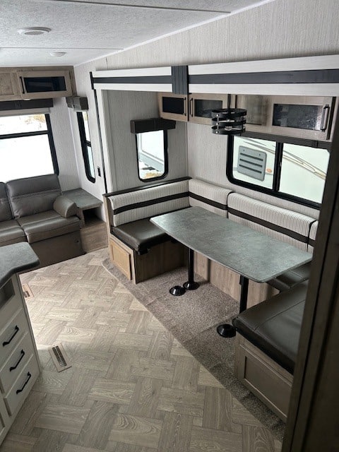The living area feels open and inviting thanks to the large slide-out with a U-shaped dinette—perfect for family meals or additional sleeping space. At the rear, a jack-knife sofa provides comfortable seating by day and extra sleeping space by night. A 40” flat-screen TV and electric fireplace create a cozy entertainment area, while ducted heating and air conditioning ensure year-round comfort throughout the coach.