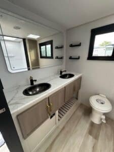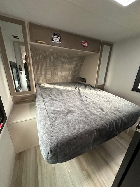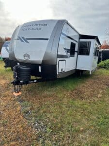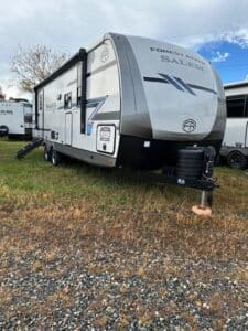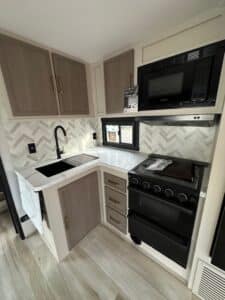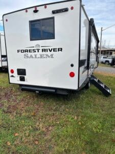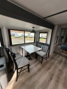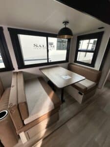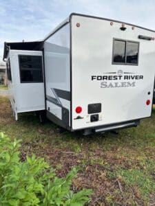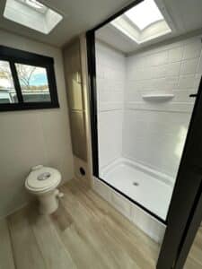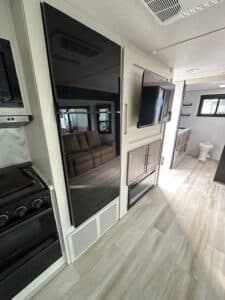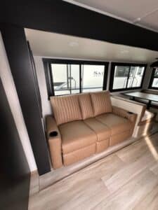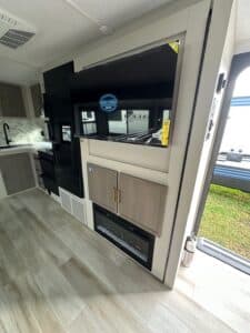 Spacious Rear Bath with residential walk-in shower (30″ × 36″) & linen storage/Private Front Bedroom with Queen Versa-Tilt™ bed & sliding barn door/Theater Seating + Fireplace in a roomy slide-out with panoramic windows/Outdoor Kitchen featuring a mini-fridge & griddle under an 18′ power awning/Premium Construction: Aluminum-framed laminated walls, fiberglass roof, enclosed underbelly, tankless water heater, and more./Luxury Interior Finish: Matte gold hardware, hidden cabinet hinges, backlit bath mirror, and motion-sensor pantry lighting. FLOOR PLAN OVERVIEW: Front Master Bedroom: Enjoy a walk-around Queen Versa-Tilt™ bed, dual nightstands, wardrobe closets, and full privacy with sliding barn doors./Center Living/Kitchen: Opposing the entertainment/fireplace center is a large slide with theater seating and a U-dinette (or optional free-standing dinette)./Rear Bath Retreat: A full residential-style bathroom spans the rear wall — complete with large shower, vanity, toilet, and generous linen storage./Outdoor Living Ready: Under your oversized awning, take advantage of the outdoor kitchen, hot/cold shower, LED lighting, and pet tether.
