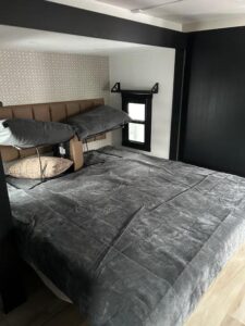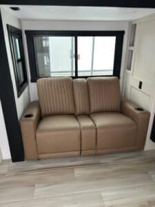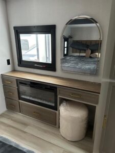 The main living area is designed for relaxation, complete with a comfortable theater-style sofa perfectly positioned across from a 50" flat screen TV and a cozy electric fireplace that adds warmth and ambiance. Dimmable LED lighting allows you to set the perfect mood day or night, and dual air conditioners ensure optimal climate control in any season.