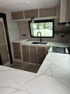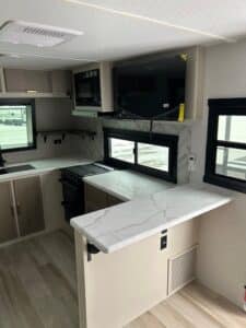The spacious front kitchen is a chef’s dream, featuring expansive counter space, raised panel cabinetry, and a convenient breakfast bar ideal for casual dining or entertaining. A large front windshield floods the area with natural light, creating an open, inviting atmosphere.