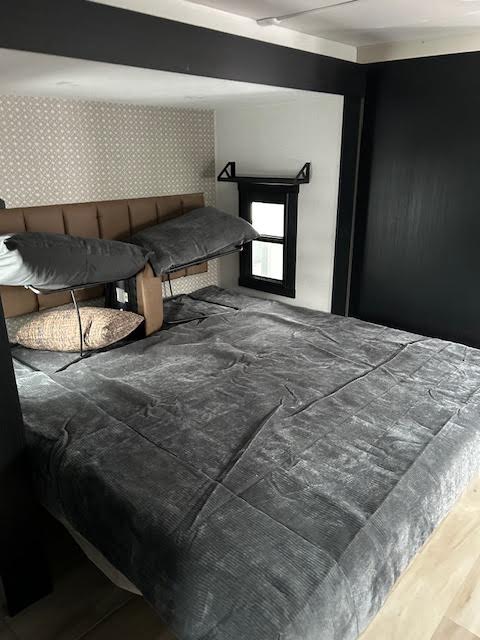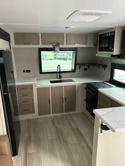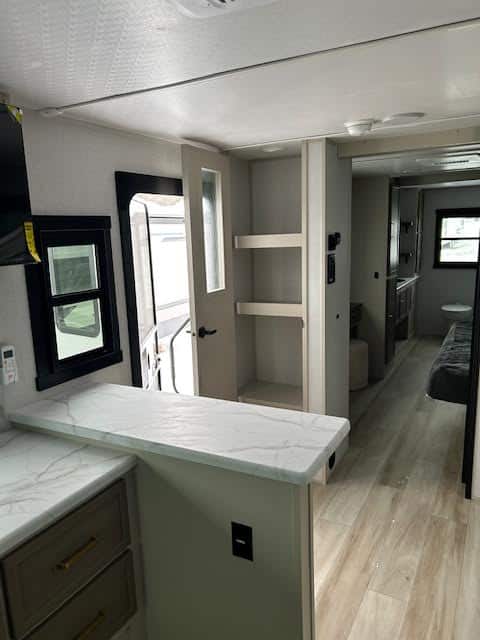 The spacious front kitchen is a chef’s dream, featuring expansive counter space, raised panel cabinetry, and a convenient breakfast bar ideal for casual dining or entertaining. A large front windshield floods the area with natural light, creating an open, inviting atmosphere.