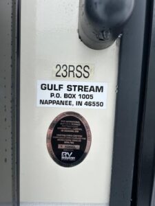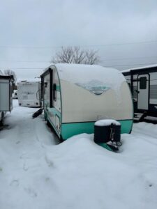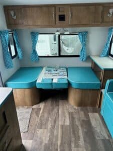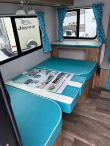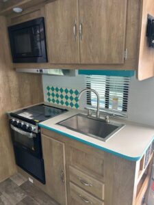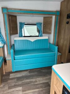 Inside, you’ll find a thoughtfully designed space that maximizes comfort and functionality. The spacious walk-around RV queen bed offers easy access from both sides, while the jack knife sofa provides flexible seating and additional sleeping space. LED interior lighting brightens the cabin efficiently, complementing the retro-modern aesthetic.