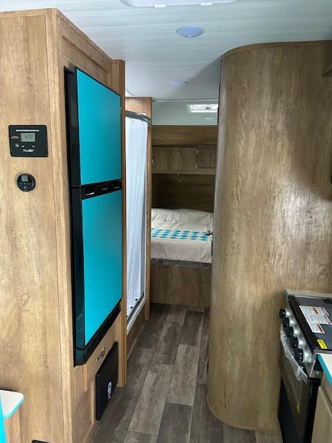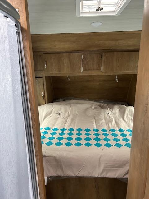 Inside, you’ll find a thoughtfully designed space that maximizes comfort and functionality. The spacious walk-around RV queen bed offers easy access from both sides, while the jack knife sofa provides flexible seating and additional sleeping space. LED interior lighting brightens the cabin efficiently, complementing the retro-modern aesthetic.