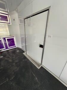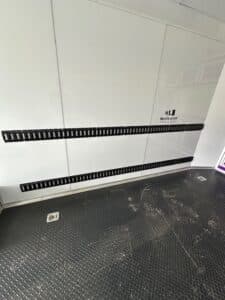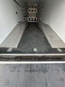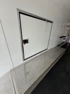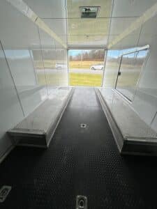 NOTABLE FEATURES: Rear Spoiler with LED Lights - 12" Additional Interior Height - Base Cabinet with 3 Doors (in front) - Upper Cabinet (in front) - Rubber Tread Plate Flooring - Rubber Tread Plate Flooring on Ramp Door - Escape Door - 30 AMP Power Package Includes Power Box, 2 110V Inside Outlets, and 20' Power Cord - White Finished Ceiling - White Metal Walls - 48" Side Door - 6 Floor Mounted D-Rings - 8.5' Flat Front Wedge - Spread Axle - Torsion Axle Upgrade - Blackout Package - Exterior LED Spot Light - Aluminum Wheel Upgrade - 16" Wheel Upgrade - Prepped for A/C - Winch